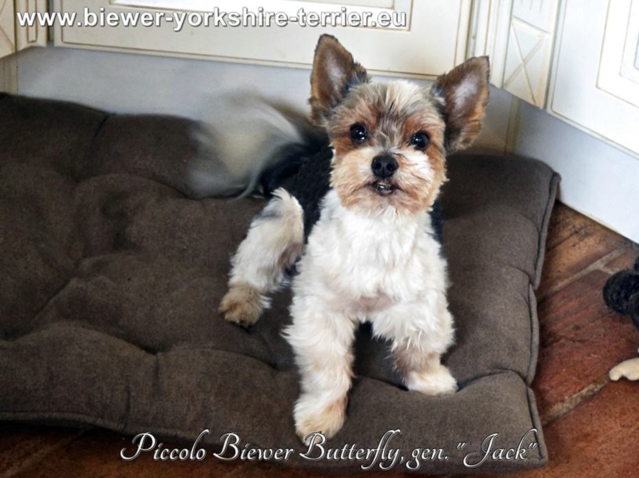 Sein offizieller Abstammungsname ist „Piccolo Biewer Butterlfly“. Seit langem waren wir auf der Suche nach einem Vererber des tiefschwarzen Rückenpigments. Auch die goldfarbenen Abzeichen am Kopf sind bei ihm stark ausgeprägt. Mit "Jack" kommen wir nun unserem Zuchtziel einen großen Schritt näher!