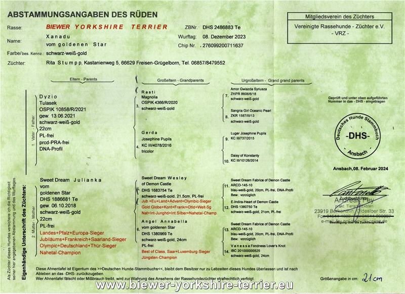 Um frisches Blut in unsere Zucht einfließen zu lassen, entschlossen wir uns Anfang 2023, einen weiteren Deckrüden zuzulegen. Puuh, das war ein Vorhaben mit Hürden. Warum? Nun, wir mussten erst einmal einen vertrauenswürdigen Züchter finden, der bereit ist, einem anderen Züchter einen Welpen zu verkaufen. Außerdem hatten wir ja auch noch spezielle Wünsche, was Farbe und spätere Endgröße betraf…