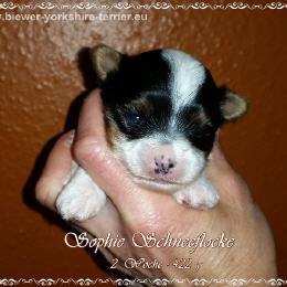 Genauso wie ihre Mutter, zählt 'Sophie Schneeflocke' zu den sehr kleinen Vertretern ihrer Rasse. Neben ihrer edlen Silhouette besitzt sie auch starke Gelenke. Den außergewöhnlich hohen Weißanteil und das seidig feine Fell hat sie ebenfalls von ihrer Mama in die Wiege gelegt bekommen.